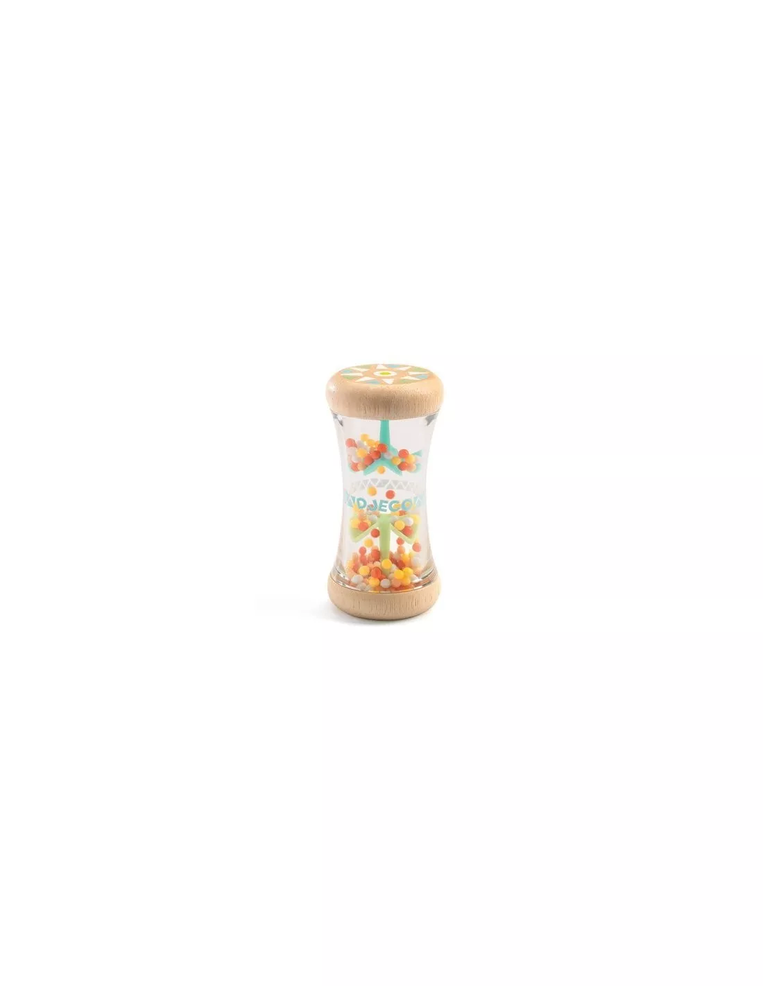 Après l’avoir retourné, il contemplera les petites billes tomber et émettre un son comme de la pluie. Un hochet aux couleurs pastel, facile à prendre en main et à secouer.