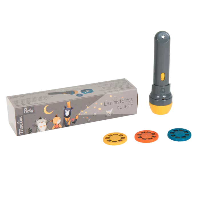 Bienvenue au royaume des chats! Lampe torche de poche où chacun des 3 disques projetés sur le mur raconte une histoire de matous. Illustrations colorées qui embarquent l’enfant pour un doux sommeil magique. Toute cette magie développe l’imagination.
