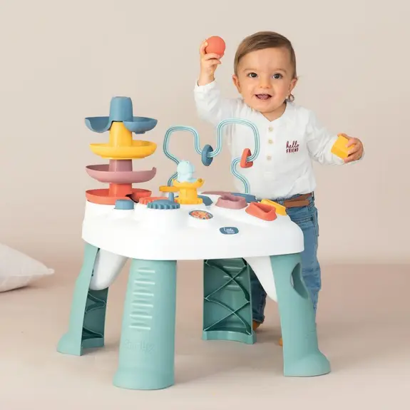 Super, cette table d’activités Little Smoby ! Elle a tout pour devenir le jouet préféré de votre tout-petit ! Cette table d’activités 1er âge propose de nombreuses fonctions mécaniques pour s’amuser tout en développant sa motricité : trieur de formes composé de 4 formes, boulier, engrenages interactifs, 1 jeu de balles avec 4 rampes modulables, catapulte pour faire sauter la balle, rouleau.