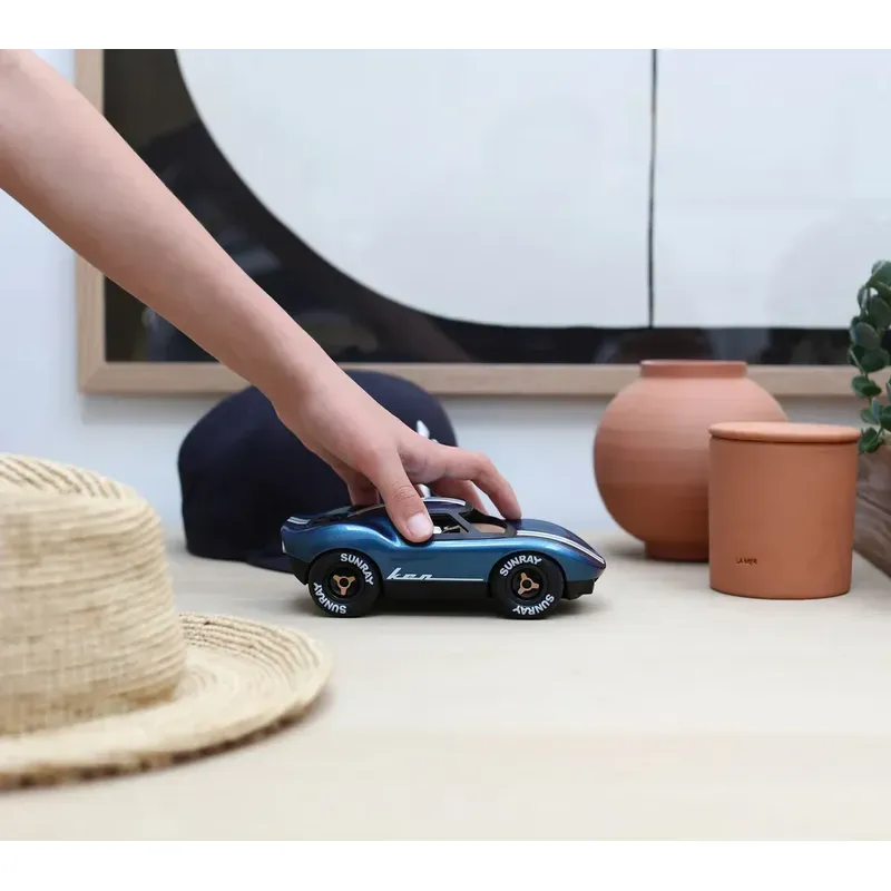 Découvrez la voiture Ken Cash de Playforever, un hommage au légendaire pilote Ken Miles. Avec ses courbes élégantes et son design rétro, cette miniature bleue et blanche est parfaite pour les petits passionnés de vitesse et les collectionneurs